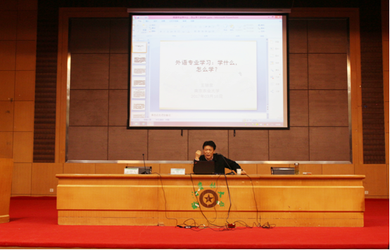 南京农业大学王银泉教授为学院学子作了题为“外院专业学习:学什么、怎么学?”的讲座,他以幽默风趣的方式深层剖析了当代外国语言学习者的特点,指出传统外语课堂缺点,同时,积极鼓励全体师生共同培养语言学习兴趣,养成良好的学习习惯。
