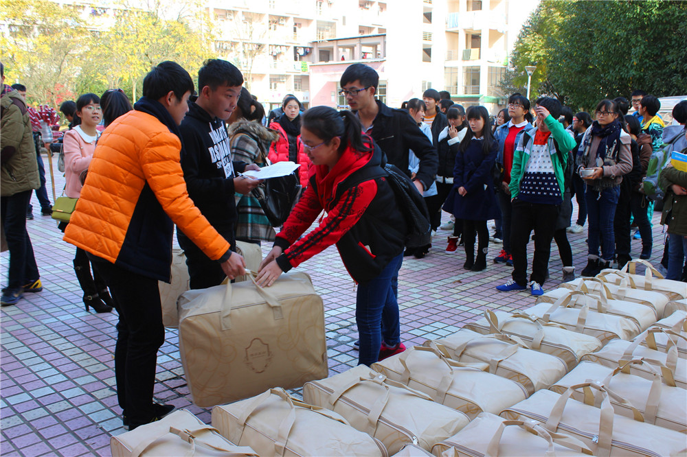 活动中,学生工作负责人与学生们进行了简短的交流。他讲到:“有困难找学院”,不论是生活上还是学习上,要及时与老师沟通;“人穷志不穷,不要自卑,要自立自强”,人生之路漫漫,不要妄自菲薄,要独立自强,刻苦努力,不断充实自我;学校设置了一系列的奖、贷、补、助、减等资助政策,给学子们提供了最好的学习环境,就是意在让每位学子都能在这里安心学习;他提醒在场的同学“要常怀一颗感恩的心”,要将爱心传递下去。随后,在场的老师们与团学中心的学生把棉被分发给了在场的学子们。