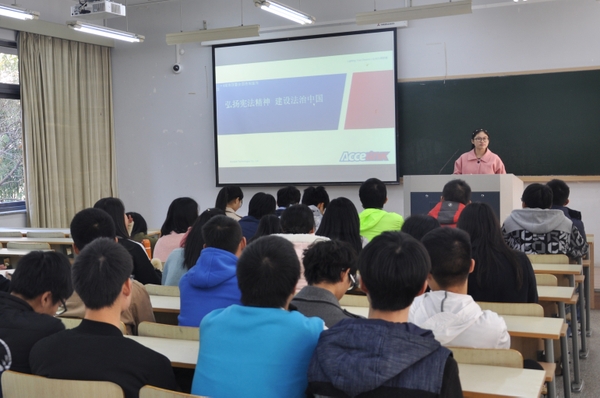 活动对宪法的定义、宪法对于大学生的重要意义、宪法的作用与原则、坚持四项基本原则的重要意义等进行了讲解说明。讲解结束后,学生们结合自己的学习体会展开了讨论。