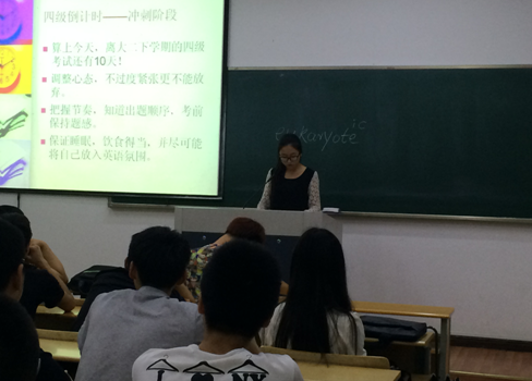 之后,辅导员对在座的同学做了英语四级考试动员。她指出,备考英语四级考试能极大地提高自身的英语技能,考试的通过也能让自己获得心理满足感和成就感,对今后就业也大有益处。她要求大家在接下去的十天冲刺时间里能做好规划,巧用真题,做好考试前的各种准备,征服英语四级考试。