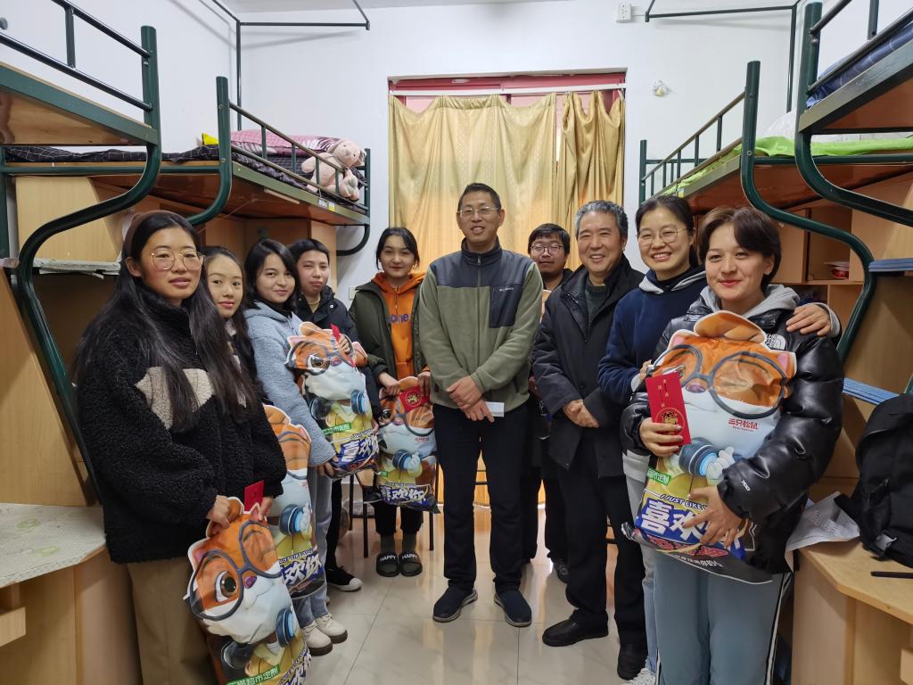 食健学院院长斯金平详细了解同学们假期在校学习生活情况,询问同学们在校期间学习和生活中遇到的困难,并结合自身经历给同学们提供了建议,嘱咐大家要合理安排好寒假时间,加强身体锻炼,注意实验室安全,过一个充实欢乐的假期、平安祥和的新年,并代表学院向同学们送上了慰问大礼包和新春祝福红包。