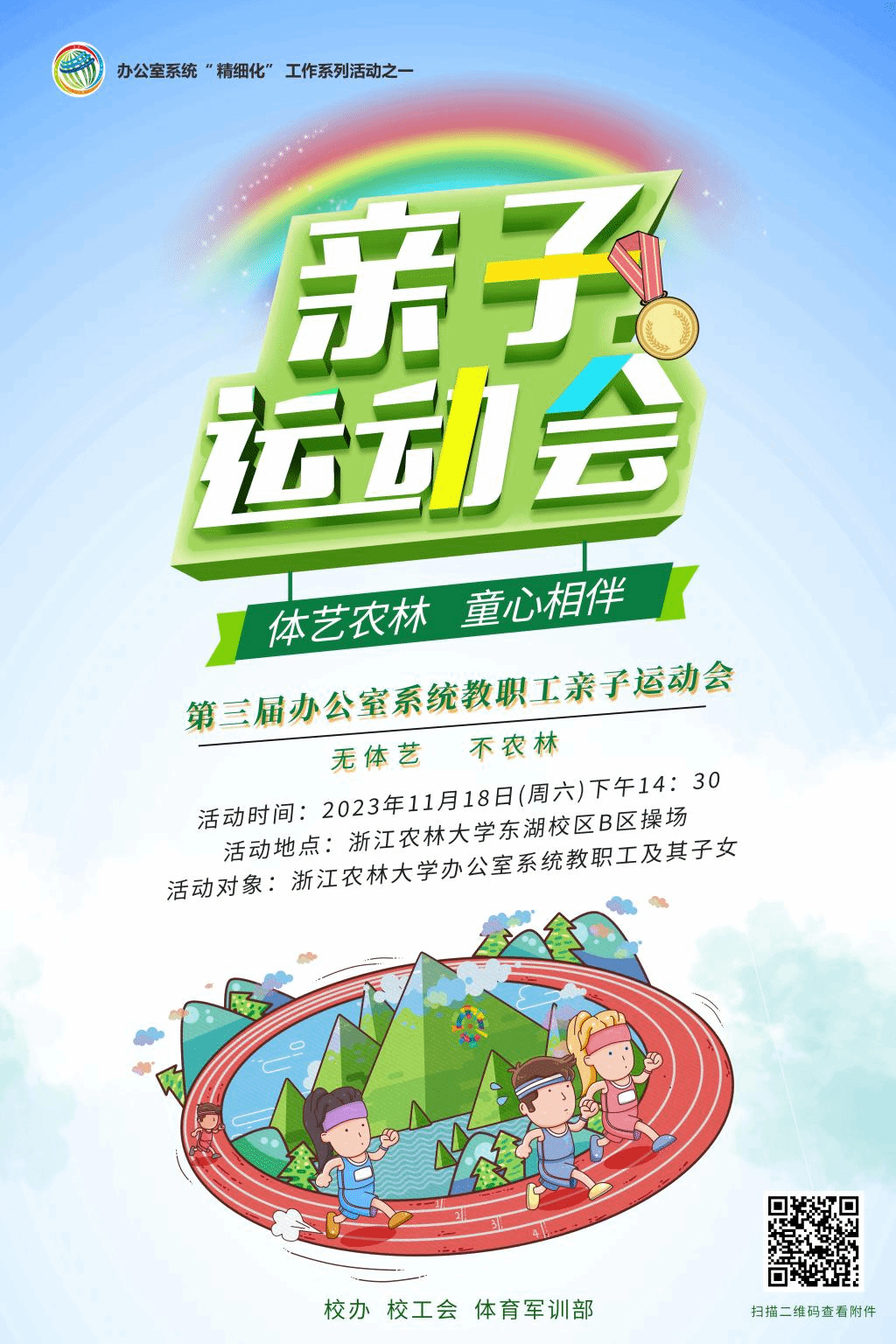 为践行“无体艺 不农林”理念,牢固树立“体艺育人,终身受益”的思想,着力提升办公室系统的凝聚力,进一步加强教职工家长与孩子之间的沟通交流,丰富教职工的业余生活。经研究,学校办公室、校工会和体军部联合举办“体艺农林 童心相伴”——BEAT365英国官网办公室系统第三届亲子运动会,以切实增强全校办公室系统人员的责任感、归属感和幸福感。