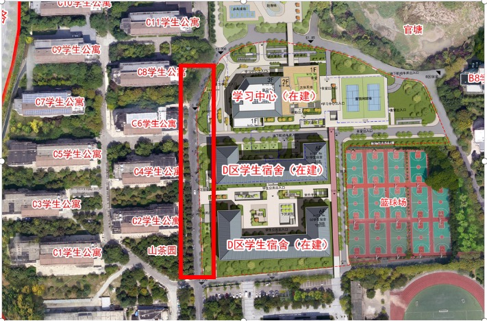 学生宿舍C2至C8东面道路,具体路段详见下图红框区域。