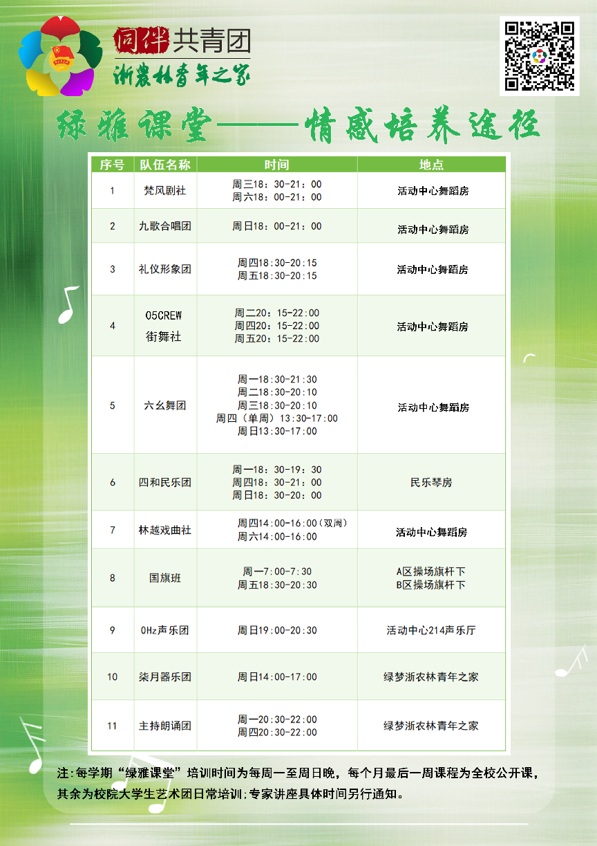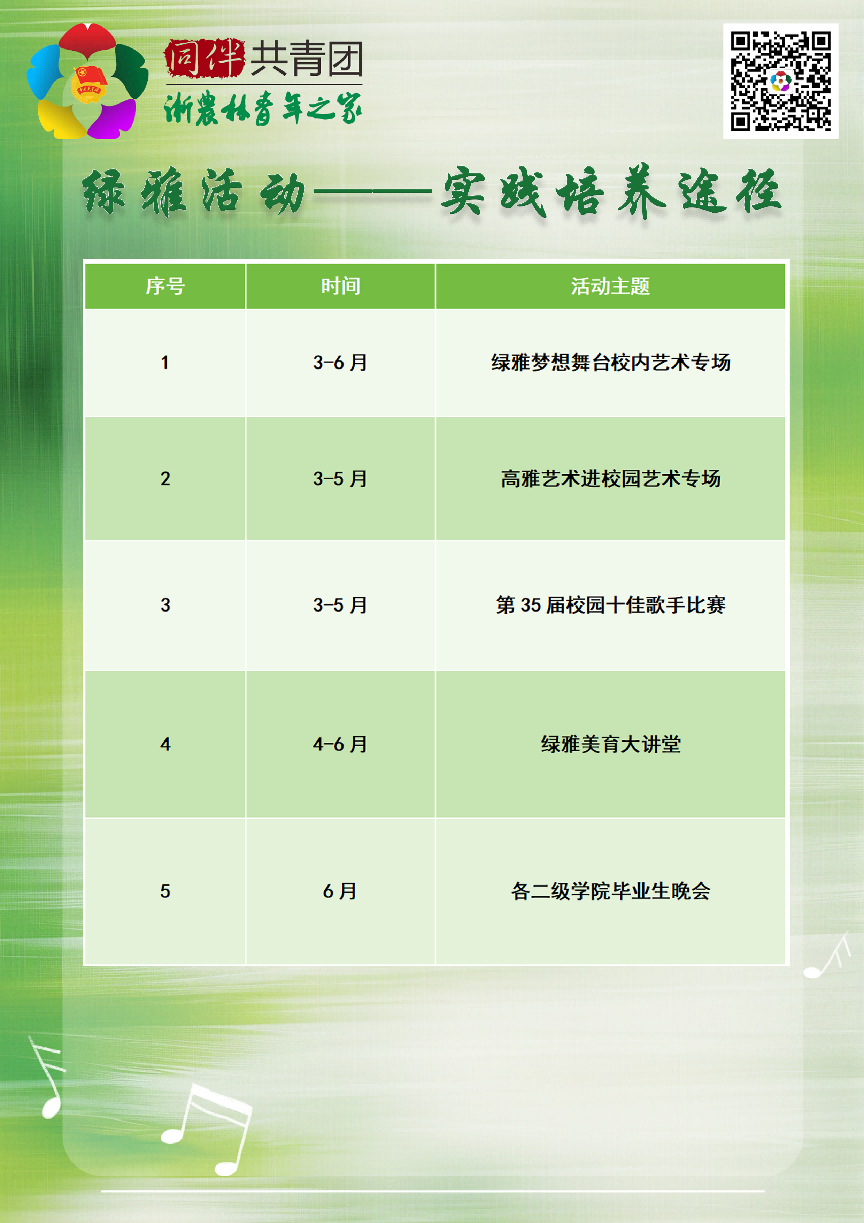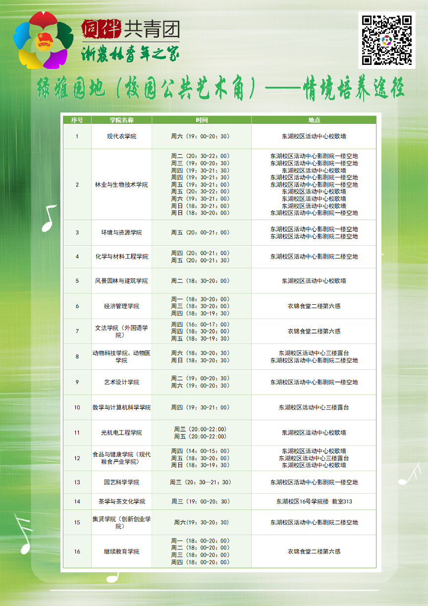 本学期“绿雅美育计划”以绿雅课堂(每周24场次)作为情感培育途径,绿雅活动(全校大型艺术活动)作为实践培育途径,绿雅艺术角(全校共设7个校园公共艺术角,每周33场次)作为情境培育途径,绿雅团队(共17个二级学院大学生艺术团,13个校大学生艺术团部门)作为朋辈培育途径,旨在号召、引导、带领全校师生聆听高雅,感受艺术,积极参与文化校园建设,力求以艺术化的方式和载体,将文化育人、审美教育贯穿学生成长的全过程,营造健康向上、格调高雅的校园育人氛围,以达到审美教育和道德教育融合育人的目的。具体安排如下: