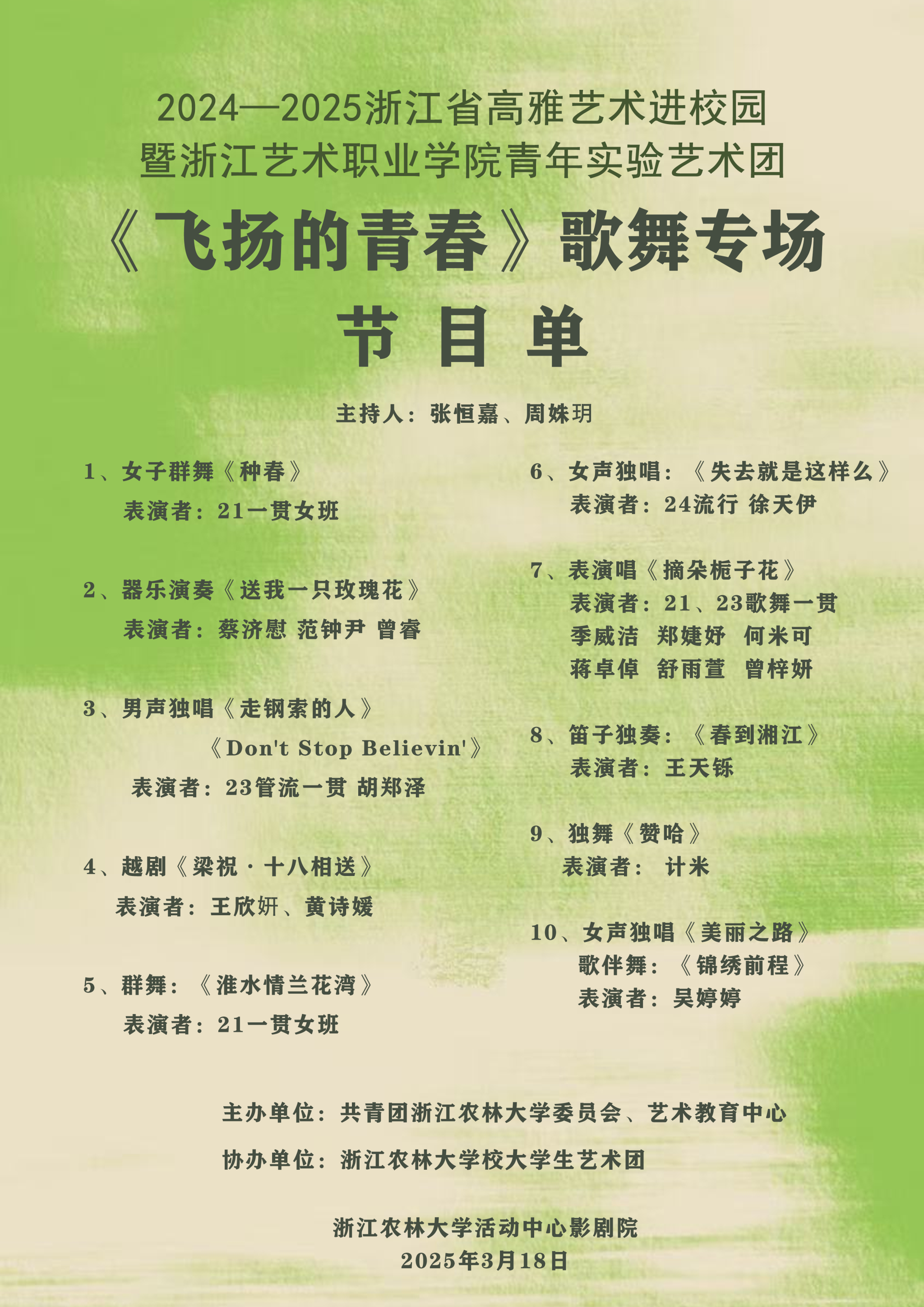 浙江艺术职业学院青年实验艺术团成立于2004年7月1日,隶属于浙江艺术职业学院。艺术团集多门类表演艺术于一体,下设民乐团、室内乐团、流行乐团、打击乐团、声乐团、合唱团、舞蹈团、越剧团、昆剧团、绍剧团、话剧团、模特队、舞美队等,演职人员全部由我院青年教师和在校学生组成。