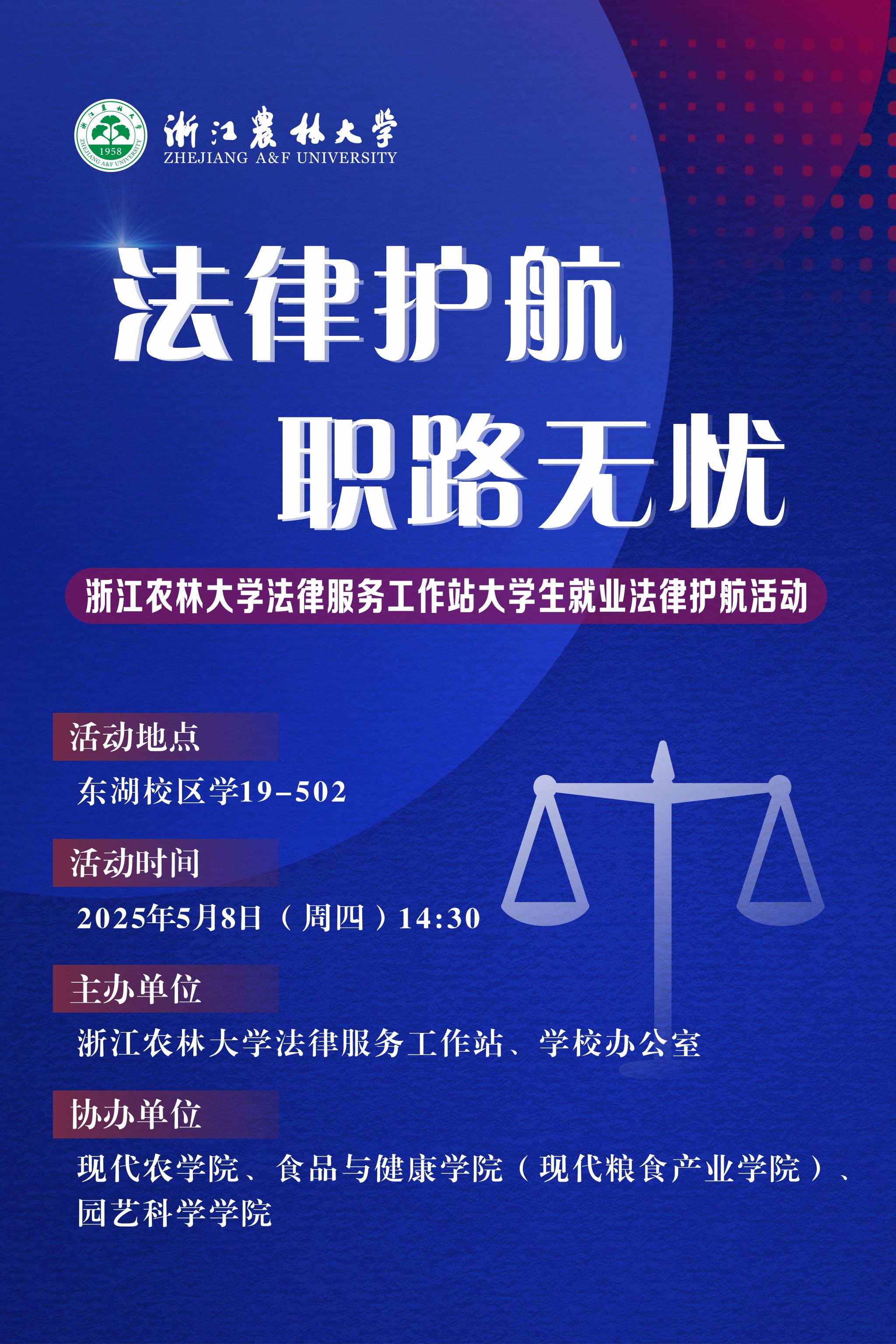 为深化法治校园建设,增强BEAT365学生就业法律风险防范意识,帮助大学生系统掌握劳动合同、权益保障及创业合规等法律知识,提升在求职应聘、实习实践及创新创业中的法律应用能力,切实维护大学生就业择业过程中的合法权益,现决定开展大学生就业法律护航活动,具体安排如下: