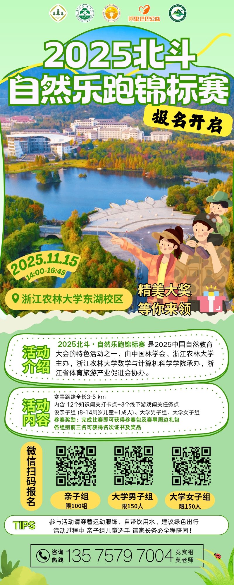 让我们在绿水青山间感受北斗科技力量,边跑边学边闯关。名额有限,手慢无!快约上好友组队,用脚步丈量自然,用科技点亮青春~ 有疑问可电话咨询,赛场见!