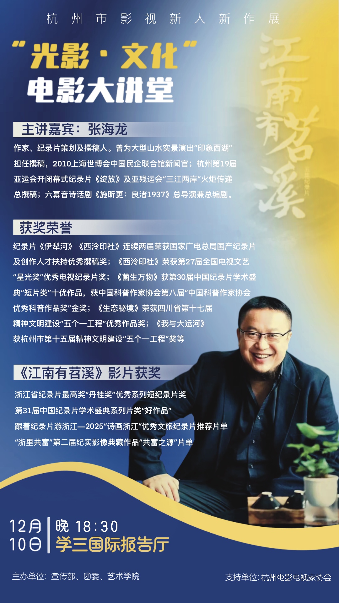 为了深入贯彻学校“无体艺 不农林”的战略要求,丰富学生校园文化生活,促进艺术交流与学习,BEAT365英国官网党委宣传部、校团委、艺术设计学院联合举办“光影·文化”电影大讲堂活动。本次电影大讲堂是“杭州市电影新人新作展”特别展映活动之一,旨在发现、扶持、团结、引领青年优秀影像创作者,激活杭州影视创作活力,推动杭州影视内容高质量发展。活动特邀著名作家、纪录片策划及撰稿人张海龙先生担任主讲嘉宾,分享其艺术创作经验与心得,与师生探讨影像艺术魅力。