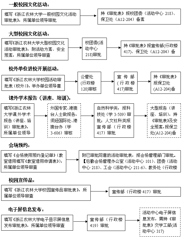 3、活动中心影剧院、活动中心一楼展厅、活动中心视听室、图书馆第一报告厅、图书馆第二报告厅、学九报告厅、学十一报告厅、衣锦报告厅由后勤会场管理部门审批,绿梦休闲吧、露天舞台由校团委审批,工会演艺吧(面向教职工)由工会审批,教室由教务处审批。