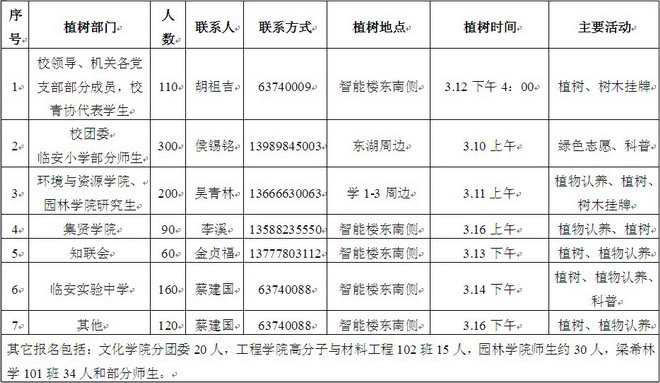 根据植树活动通知,经相关部门报名,全校1000多名师生(含临安部分中小学生)报名参加3.12植树系列活动,经我处统筹安排,具体植树节活动安排如下: