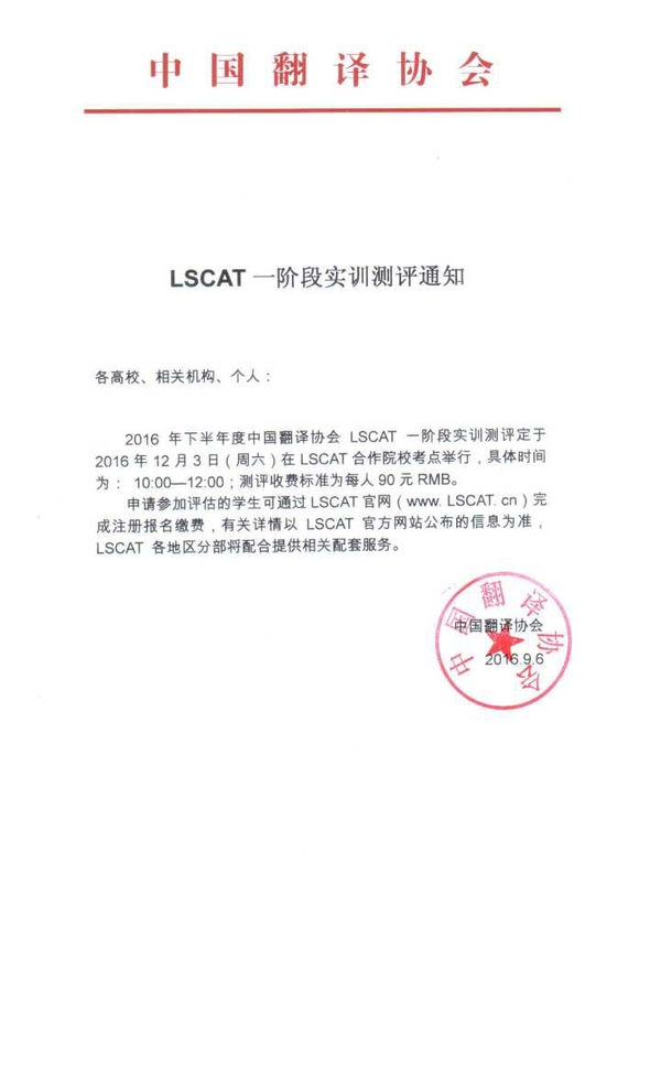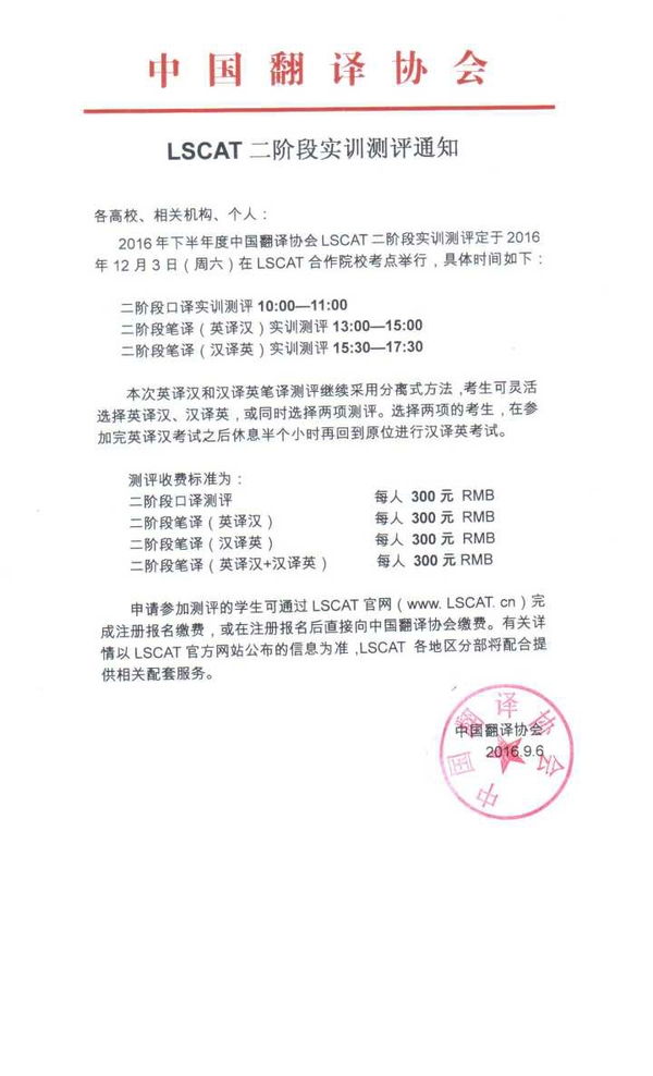 2016年下半年度中国翻译协会语言服务能力评估(LSCAT)将于2016年12月3日(周六)进行,申请参加评估的学生可以通过LSCAT官网(www.LSCAT.cn)完成注册报名缴费,有关详情以LSCAT官方网站公布的信息为准。