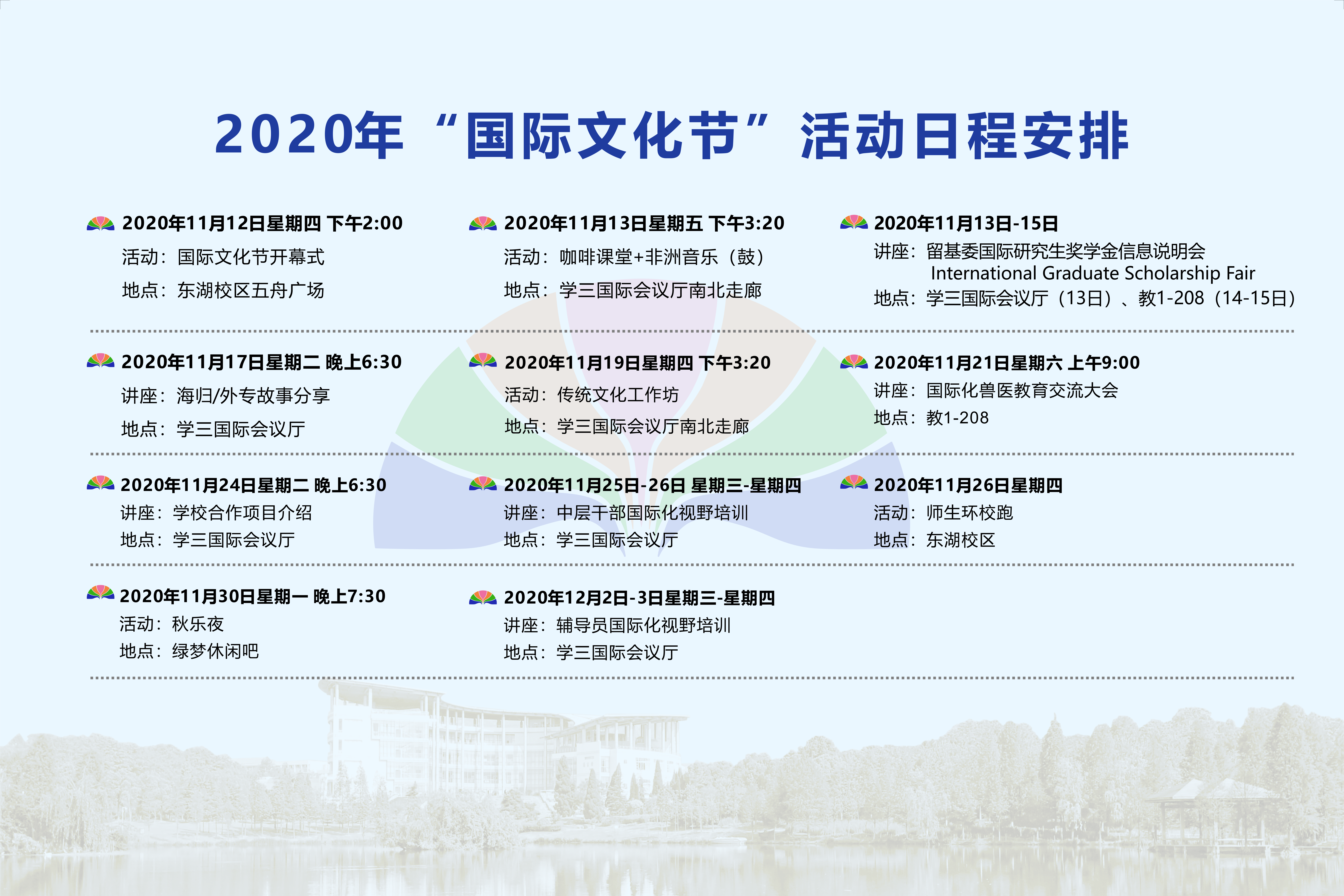 为提升全校师生国际化意识和能力,搭建一个相互理解、尊重包容、和谐互鉴、美美与共的多元文化交流平台,彰显BEAT365英国官网的国际化特色和多元文化气息,学校将在11月组织国际文化节系列活动,具体活动安排如下: