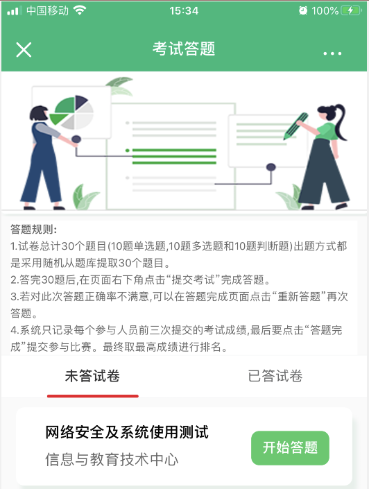 5. 系统只记录每个参与人员前三次提交的考试成绩,最后要点击“答题完成”提交参与比赛。最终取最高成绩进行排名。