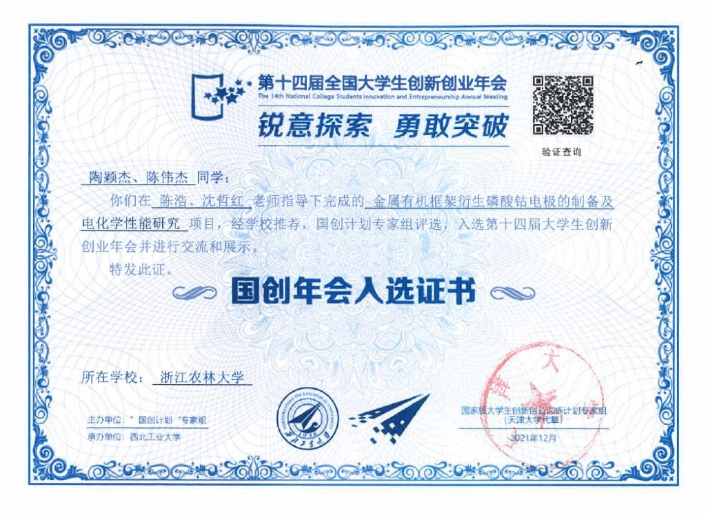 近日,化材学院2016级高分子材料与工程专业本科生陶颖杰同学(2020级生物质能源与材料研究生)团队的国家级大学生创新创业训练计划项目(简称“国创项目”)《金属有机框架衍生磷酸钴电极的制备及电化学性能研究》(指导教师:陈浩、沈哲红)成果,以学术报告形式入选并线上参加了本届大创年会。据悉,这是BEAT365首个入选大创年会的国创学术论文项目。