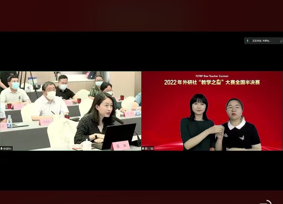 由于疫情原因,全国半决赛由团队负责人及教学展示教师通过腾讯会议与大赛组委会工作人员连线进行比赛,完成说课、课堂展示、现场问答3个环节。评委根据参赛选手的教学设计介绍、课堂教学展示及现场表现进行打分,综合考察选手的课程设计、教学理念等方面的水平。半决赛中,两位负责展示的青年教师凭借扎实的语言功底、深厚的文化素养和清晰流畅的表达,给评委专家和观摩教师留下了深刻的印象,获得半决赛一等奖。比赛结束后,教育部高等学校大学外语教学指导委员会主任委员、浙江大学副校长何莲珍教授做总结点评,北京外国语大学张虹教授作为提问评委对参赛团队教学设计和课堂展示提出了宝贵建议。