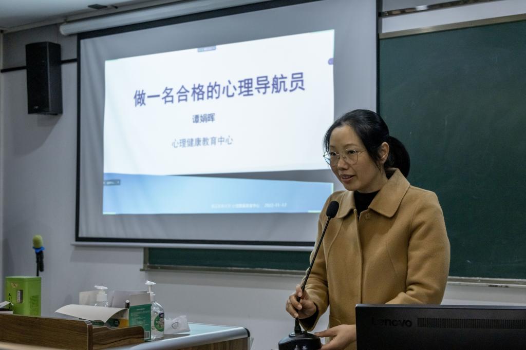 谭娟晖从做一名合格的心理导航员为切入点,特别指出加强心理健康教育是提高大学生心理素质、促进大学生健康成长、培养全面发展的社会主义合格建设者和可靠接班人的重要途径。同时向同学们普及心理健康知识和大学生中常见的心理健康问题,通过生动形象的案例表明朋辈心理互助在大学生心理健康教育中不可替代的作用。