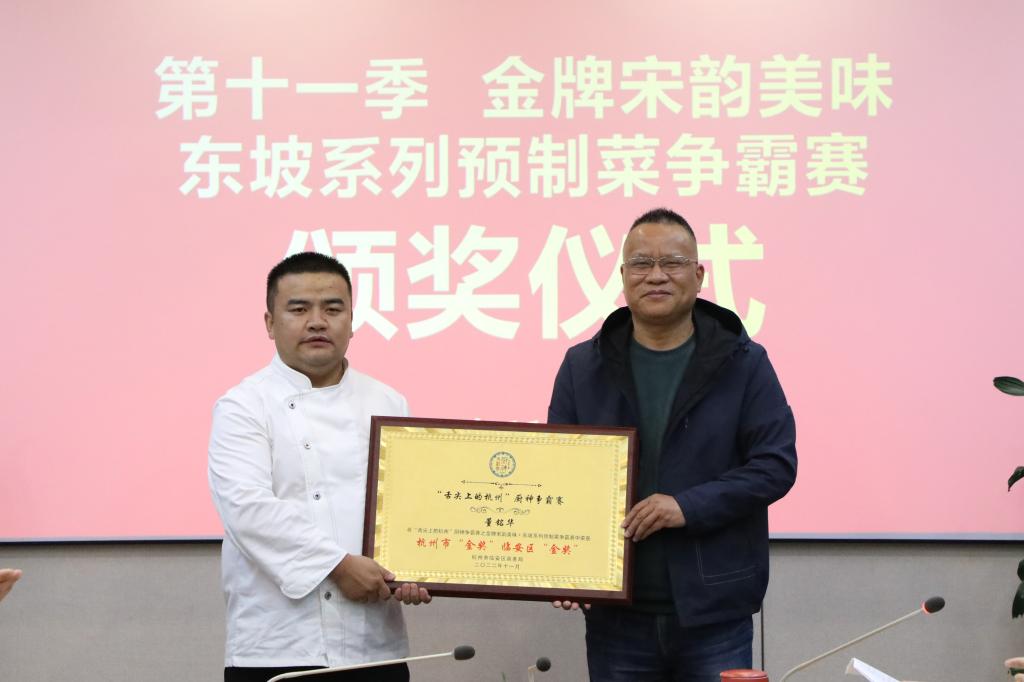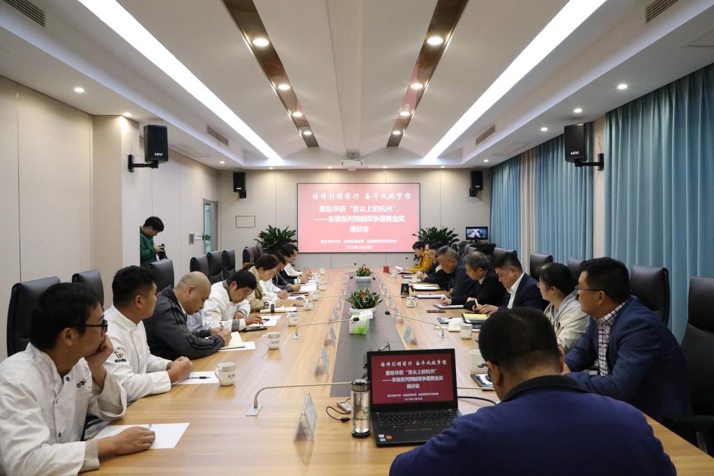 11月21日,董铭华获“舌尖上的杭州”——东坡系列预制菜争霸赛金奖座谈会在第一会议室召开。临安区商务局副局长谢东明、商务促进中心主任蓝石、妇联主席石惠娟,临安区餐饮行业协会会长朱加同、秘书长余小建,临安区餐饮行业工会联合会主席徐华,后勤中心主任、党委书记,吴越公司总经理吴通苗,吴越公司相关负责人出席。