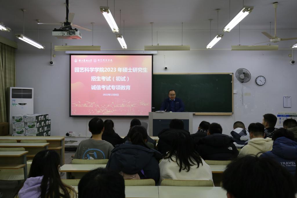 12月8日,园艺科学学院进行考研学生诚信考试专项教育暨关怀慰问活动。学院党委书记何振波及相关负责人和全体考研学生参加活动。