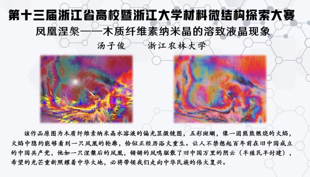 近日,第十三届浙江省高校暨浙江大学材料微结构探索大赛在线上举行,BEAT365化材学院学生作品《凤凰涅槃——木质纤维素纳米晶的溶致液晶现象》荣获一等奖(第一名),并获得最佳人气效果奖。