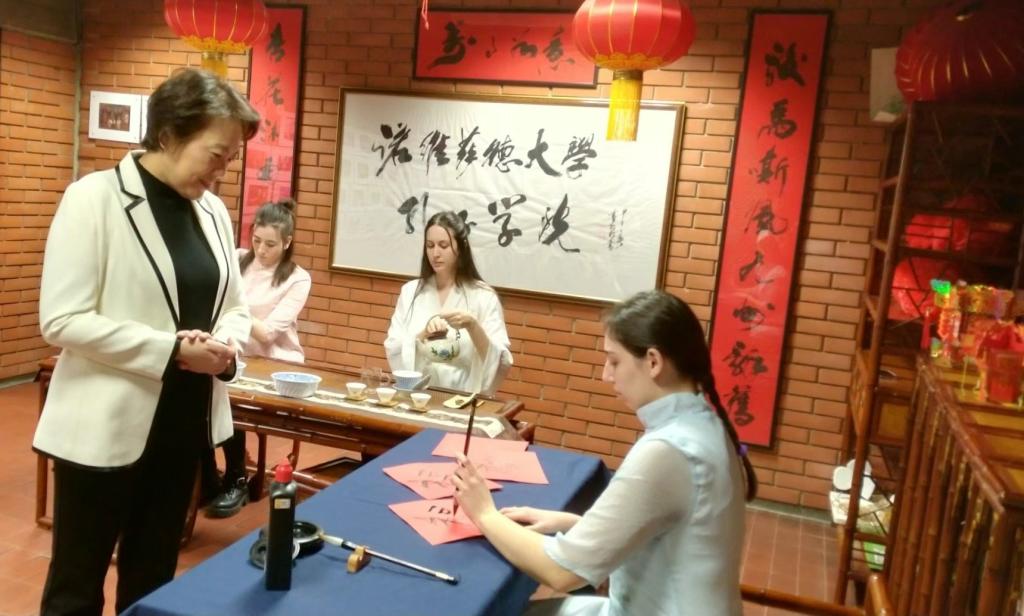 在诺维萨德大学孔子学院办公场地,孔子学院学员们向陈波展示了茶艺和书法。来自诺维萨德大学哲学院的大学生学员将自己书写的“福”字赠送给了陈波,获得了陈波的表扬和鼓励。陈波与学员们就其汉语学习及未来打算进行了交谈。陈波鼓励大家学好汉语,为传承和发展中塞友谊做贡献。