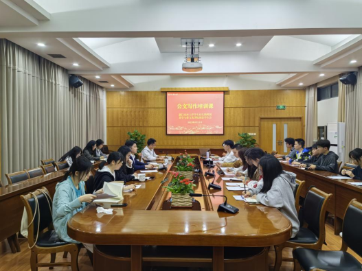 培训会上,校长办公室相关负责人结合工作实际,以“以文育人·以文辅政·以文促进”为主题,从文章的立题、定形、成章、顺语等角度切入,指导同学们写作公文。同时,他对同学们在日常写作、材料分析中常见的问题进行了耐心解答。
