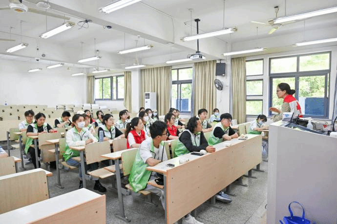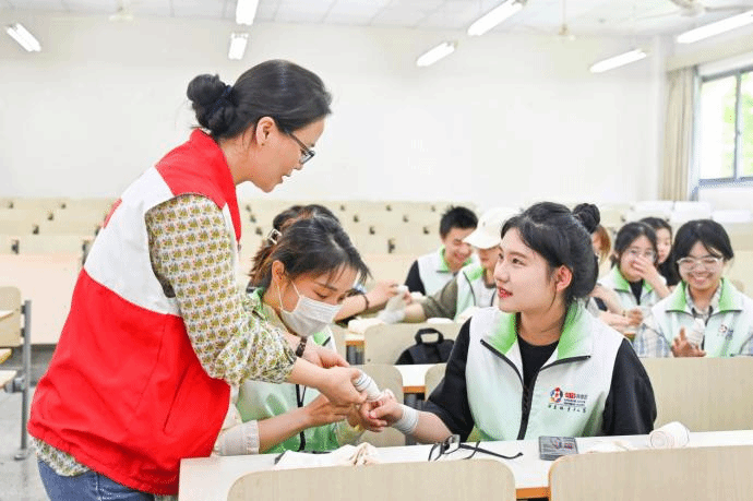 本次培训分为线上基础知识学习测评和线下实操培训。由临安红十字会老师逐一讲解各类创伤救护、胸外按压、人工呼吸等急救理论与施救技巧,并现场实操绷带、三角巾包扎等方法,并教授志愿者如何应对和处理一些比赛场上的突发情况,在有效的抢救时间内进行现场救护。在老师生动、形象的演示讲解下,同学们认真听讲,详细记录,积极互动。