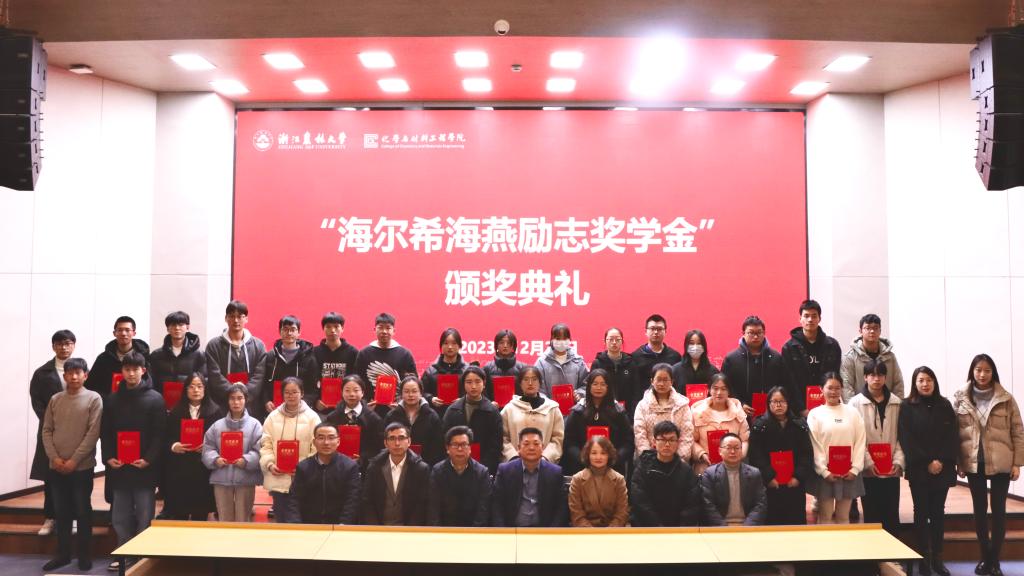 12月28日下午,化材学院举办第一届“海尔希海燕励志奖学金”颁奖典礼。杭州海尔希畜牧科技有限公司董事长楼伟杰、总经办主任兼工会主席王毅、技术研发部经理王力,化材学院党委书记谢志新及学院相关负责人出席活动,应用化学学科教师代表、2022级和2023级120余名学生参加活动。