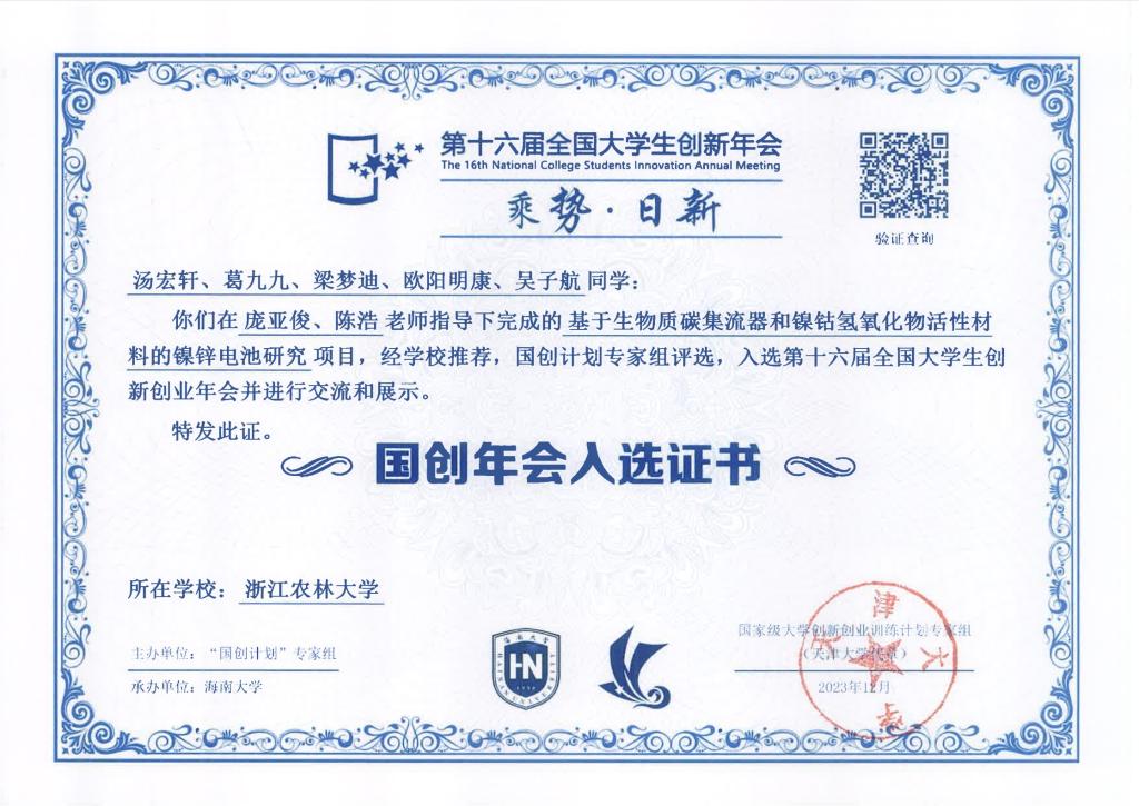 近日,化材学院生物质微纳米功能材料实验室的2019级高分子材料与工程专业本科生汤宏轩等学生团队完成的国家级大学生创新创业训练计划项目(简称“国创项目”)《基于生物质碳集流器和镍钴氢氧化物活性材料的镍锌电池研究》(指导教师:庞亚俊、陈浩),以学术论文形式入选并参加了第十六届全国大学生创新年会。