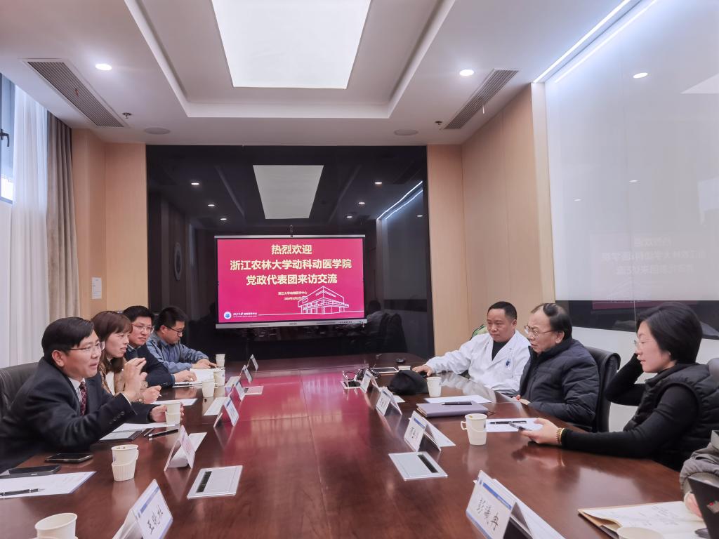 3月2日下午,校党委委员、动科动医学院院长宋厚辉一行赴浙江大学动物医学中心参观学习,浙江大学动物医学中心主任周继勇等陪同参观交流。