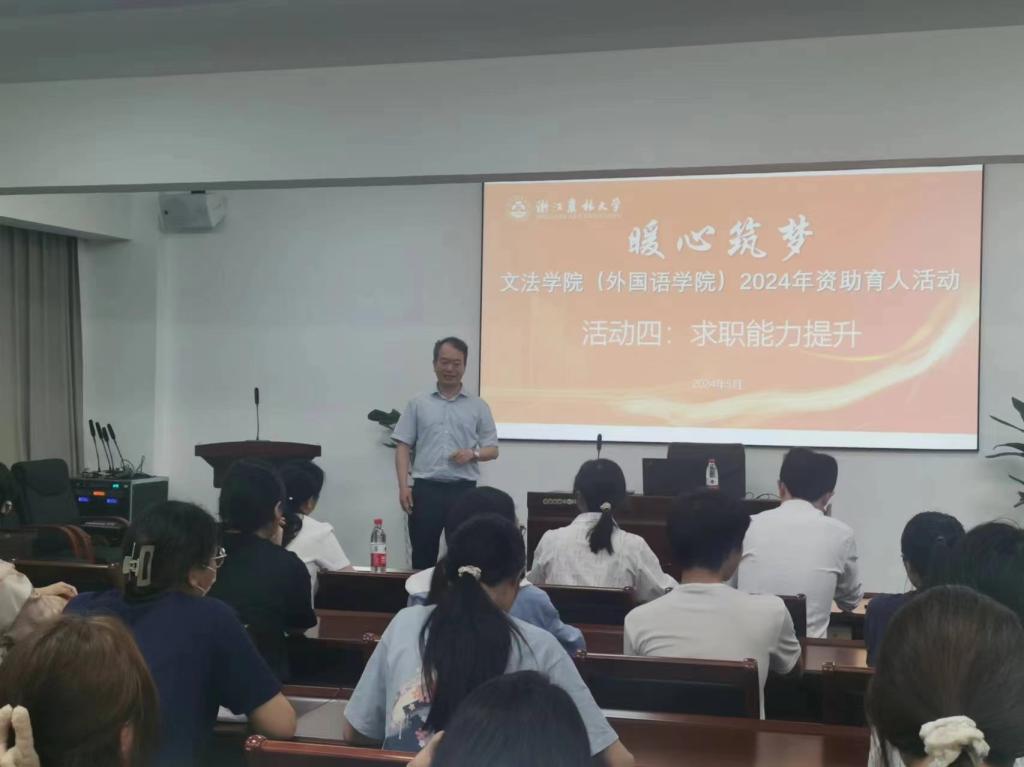 5月30日晚,文法学院“暖心筑梦”资助育人系列活动之求职能力提升培训在衣锦校区实验楼502举办,学院党委书记朱红东及学院相关负责人,中国语协演讲口才协会副秘书长、校“同伴”语言工作室教师严景城,资助管理辅导员及学生资助对象代表参加活动。