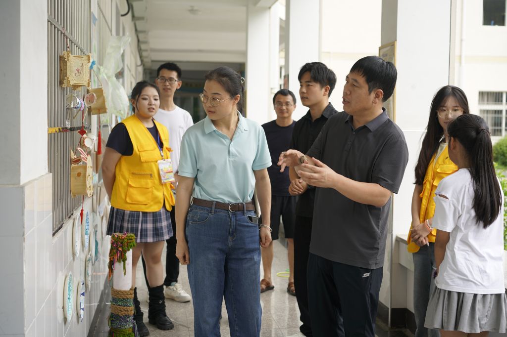 黄晓芳一行参观了“艺术+”彩虹课堂成果展,彩虹课堂的湍口镇小学学生代表为大家介绍了同学们在课程中制作的手工扎染、水彩画作、剪纸作品等。黄晓芳充分肯定了“艺术+”彩虹课堂的教学成果,代表学院党委对暑期社会实践团队成员表达慰问,希望同学们以本次实践为基础,拓展实践形式、总结实践经验,形成“艺术+”美育实践品牌。