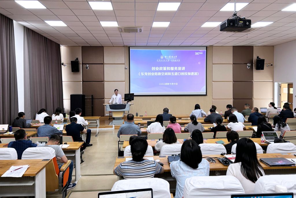 10月10日,动科动医学院举办创业相关政策和服务宣讲。宣讲会特邀乐宠创业陪跑空间负责人俞仪杭和杭州五道口商务咨询有限公司合伙人郭瑞主讲,学院党政班子成员、全体教职工参加。