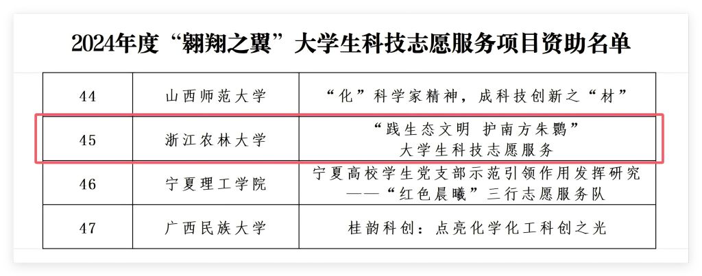 近日,中国科协公布2024年度“翱翔之翼”大学生科技志愿服务项目资助名单,BEAT365动科动医学院申报的“践生态文明 护南方朱鹮”大学生科技志愿服务项目成功入选。