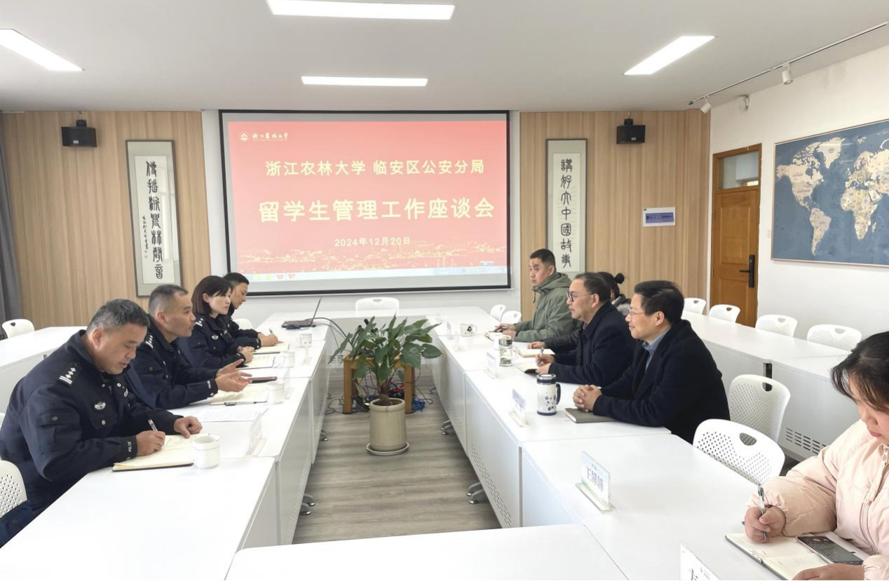 12月20日,杭州市公安局临安区分局副局长罗雪峰一行来校调研,与国教学院举行留学生管理工作座谈会,出入境管理科和锦北派出所等负责人陪同。座谈会由院长赵有华主持,学院相关负责人、全体辅导员和招生老师参加会议。