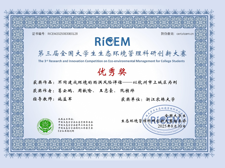 近期,第三届全国大学生生态环境管理科研创新大赛总决赛落幕。大赛由中国生态学学会生态管理专委会、青年工作委员会、教育工作委员会和E方智库期刊等机构联合承办。由园林学院施益军副教授指导,研究生葛云鹏、周歆喻、王志豪、阮桢烨团队所提交的作品《不同建成环境的雨洪风险评估--以杭州市上城区为例》荣获全国优秀奖。