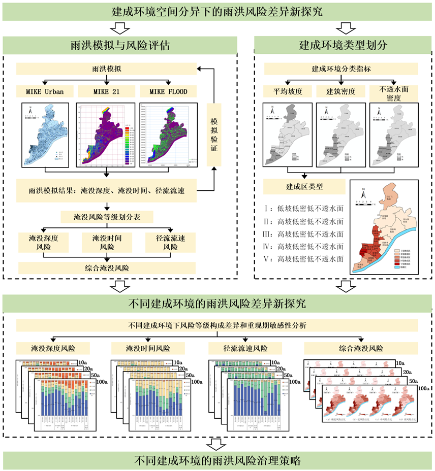 近年来,全球气候变化与城市化进程的叠加背景下,城市雨洪灾害的潜在风险显著加剧,加强城市内涝治理,推进韧性城市建设成为当下城市发展的重大议题。基于此,团队基于MIKE FLOOD平台,耦合MIKE Urban与MIKE 21模型,对杭州市上城区不同建成环境类型下的雨洪风险进行模拟与评估。研究构建了五类典型城市建成环境类型,系统分析其内涝深度、历时与流速等风险特征的空间异质性,并提出“建成环境类型划分-风险特征分析-空间策略提出”的研究框架,以突破传统风险评估中“均质视角”的局限。