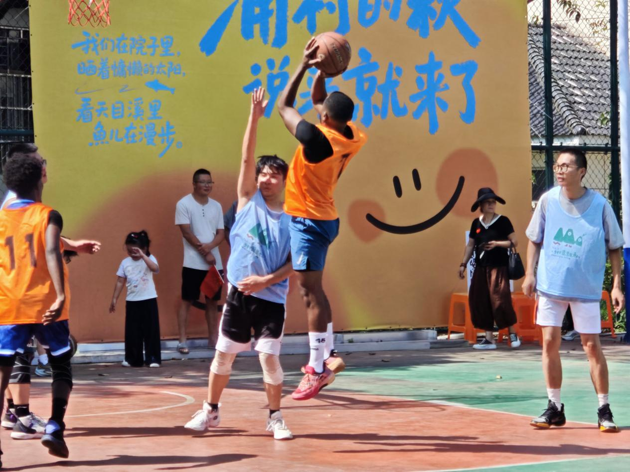 除文化互动外,篮球场上还上演了一场精彩纷呈的“涌村村BA斗牛赛”。留学生与本地青年展开3V3对决,双方积极跑动、精准传球、奋力上篮。尽管语言文化各异,但默契的配合与友好的氛围贯穿始终。