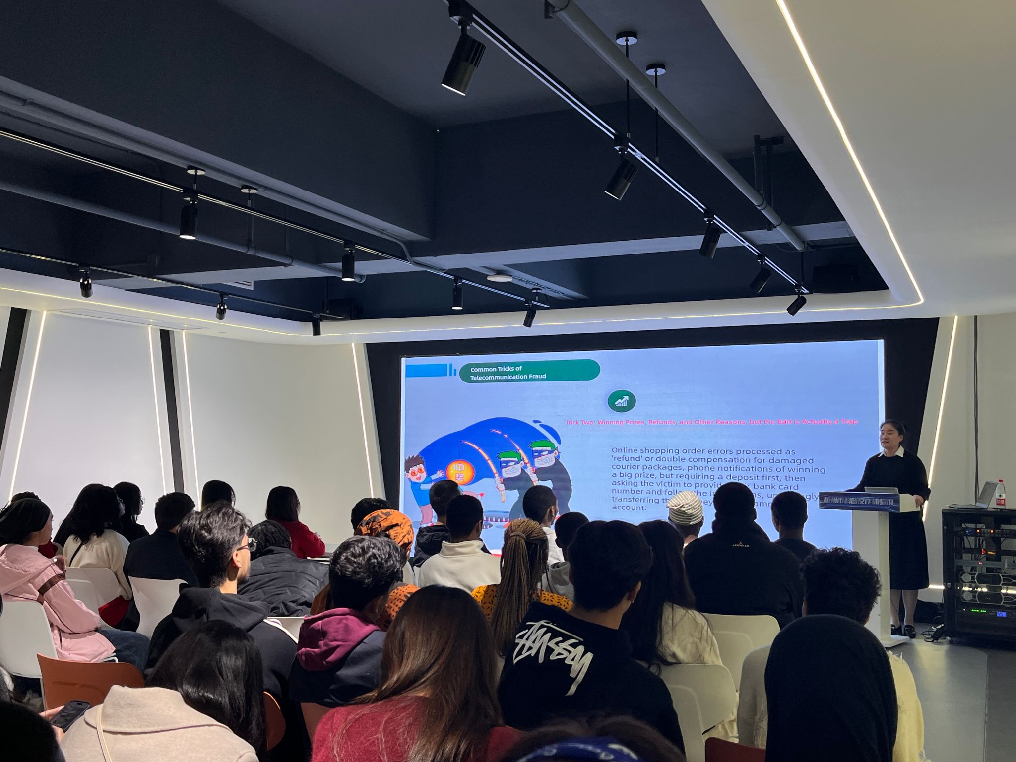 在体验馆中,留学生们系统学习了电信网络诈骗黑灰产业链的运作机制,以及在中国常见的诈骗类型和防范要点。通过佩戴VR反诈一体机设备,他们“亲身”走入模拟诈骗场景,直观感受多种高发诈骗手法,在虚实结合中加深了对诈骗危害的认识。反诈剧场和反诈公开课结合留学生生活中可能遇到的网络购物、冒充使领馆、虚拟交易等高发骗局,进行场景化解析与防范指导,让留学生们从理论到实践深入了解防范电信网络诈骗的各项要点。