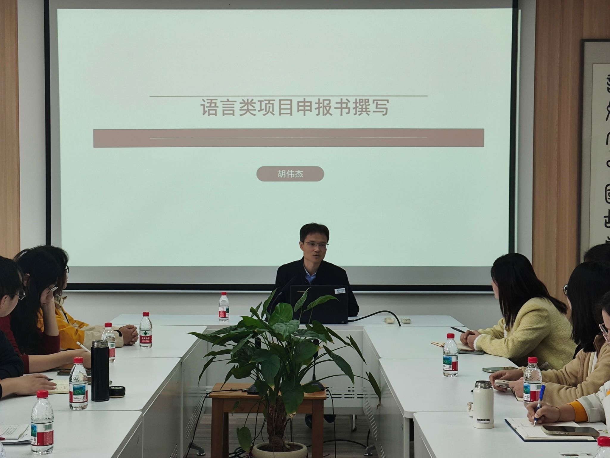 胡伟杰教授围绕“语言学类项目申报书撰写”,聚焦申报书撰写的核心要素,重点围绕“选题”“论证”与“创新点”三大难点展开。在选题方面,他强调了问题意识的重要性,认为选题应兼具理论前沿性与现实关照,并充分考虑研究基础与可行性。在论证部分,他详细讲解了如何构建逻辑严密、层次清晰的研究框架,如何有效呈现研究内容、思路方法及重点难点,以提升论证的说服力。关于创新点的提炼,胡教授结合生动案例,指导大家如何精准挖掘并阐述研究的理论、方法或应用价值,使其成为申报书的突出亮点。