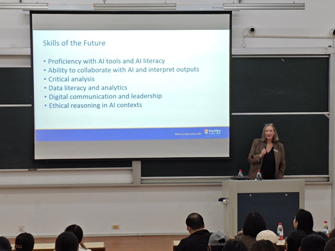 作为商业史专家,Lucy Newton教授为经管学院同学作了《人工智能重塑商业:机遇与挑战》专题报告。她以“人工智能如何重塑商业”为核心,向同学们介绍了AI在商科领域的应用现状,结合当前商科学生就业困惑,拆解当下热门商科岗位的真实工作场景,说明能力需求重塑的紧迫性,帮助学生清晰定位未来学习重点。