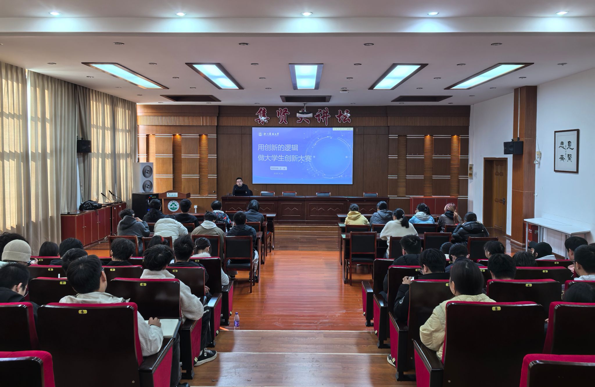 11月22日下午,集贤学院401集贤大讲坛座无虚席,一门聚焦创新实践能力的全新课程——《大学生创新大赛》实践课程正式开课。该课程面向全体求真实验班学生,通过创新大赛全过程的实践探索和创新创业训练,强化大学生在创新思维、创新大赛等方面的能力,训练大学生的创新素养。