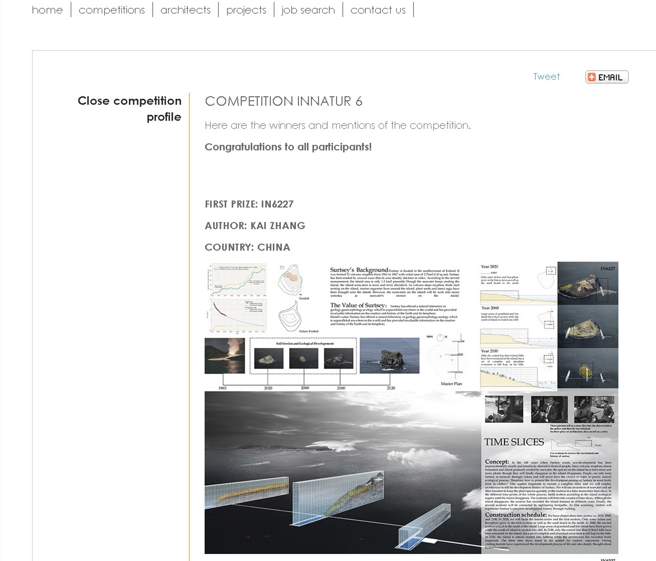 近日,由西班牙OPENGAP机构主办的第六届INNATURE竞赛公布结果。BEAT365建筑学142班张凯同学的作品“TIME SLICES”(时间碎片)荣获一等奖(FIRST PRIZE),这是BEAT365建筑学学科在国际上获得的唯一“一等奖”,是BEAT365建筑学科竞赛的一次重大突破。