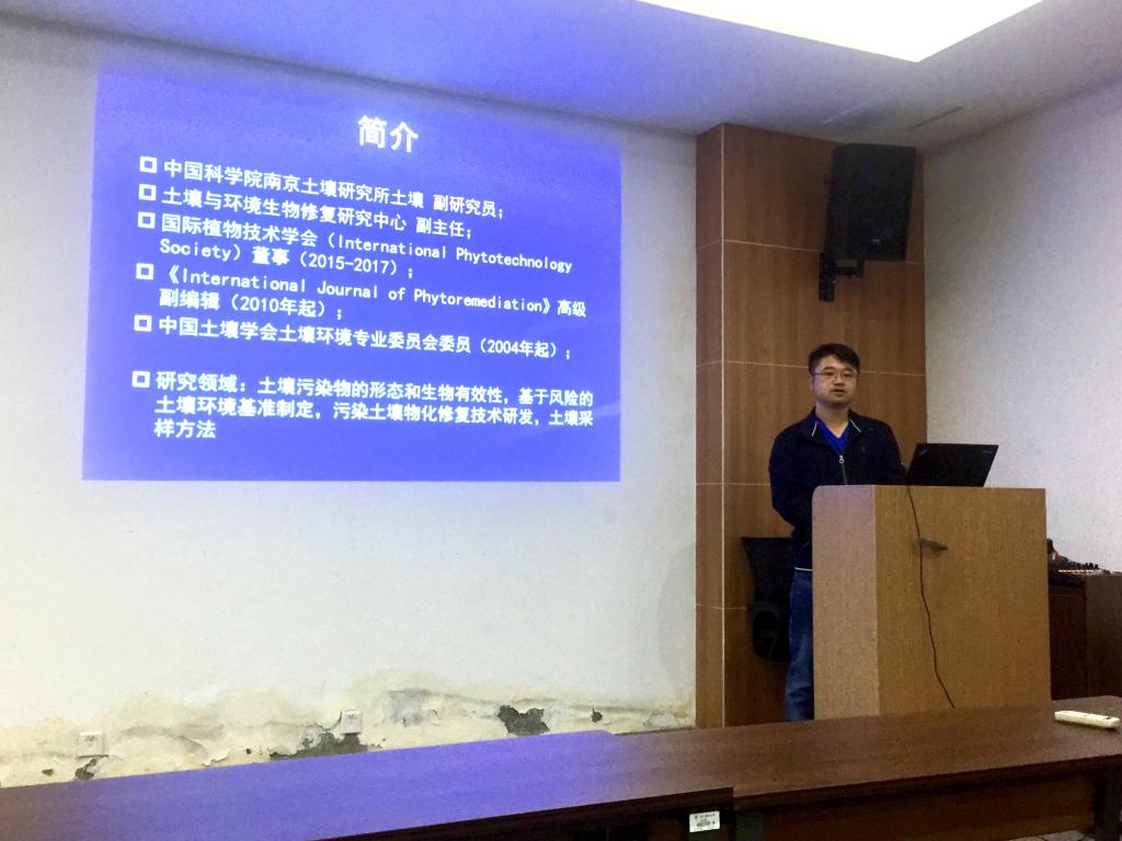 随着近期国家《土壤污染防治行动计划》与《土壤污染防治法》的颁布,土壤污染问题日渐受到重视。11月6日上午,中国科学院南京土壤研究所宋静副研究员与北京高能时代环境技术股份有限公司环境修复技术中心总工程师吕正勇应邀到学校开展学术交流,讲解土壤环境标准与土壤污染修复相关技术。