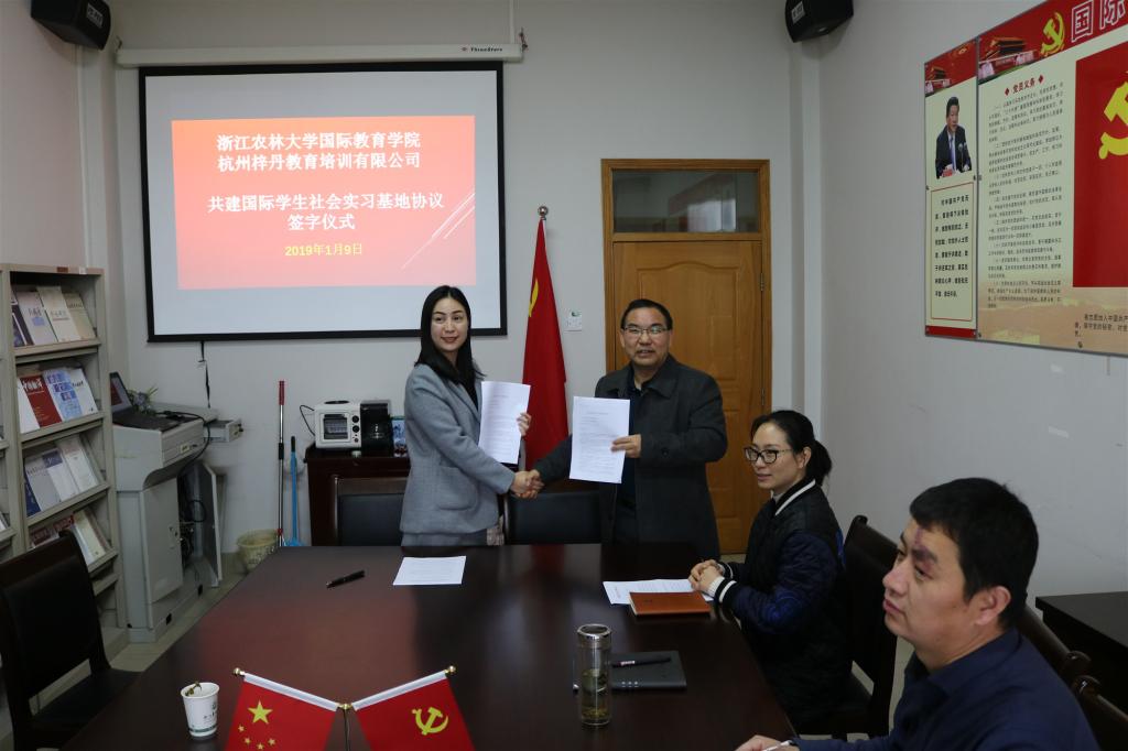 1月9日,国际教育学院与杭州梓丹教育培训有限公司签署“共建国际学生社会实习基地”和“游学项目合作框架协议”。国际教育学院院长赵有华及国际学生办公室相关人员,杭州梓丹教育培训有限公司负责人翁丹丹及公司相关代表参加了签约仪式。