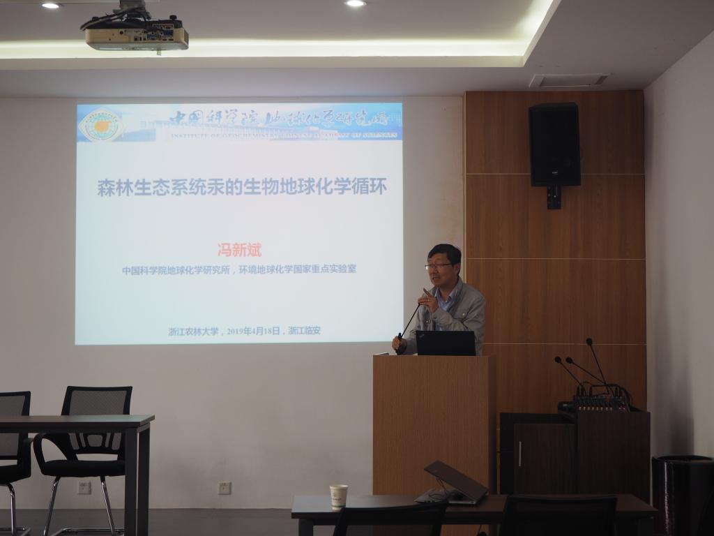 冯新斌研究员介绍了中国科学院地球化学研究所的历史沿革以及目前的主要研究方向。他以森林生态系统汞的生物地球化学循环为主题,介绍了森林生态系统对汞在不同环境介质传输的影响。冯新斌课题组利用汞稳定同位素手段在云南哀牢山开展了植被叶片-大气界面间气态汞交换过程的系统研究,并利用同位素技术手段证实来自于凋落物的汞沉降是大气汞进入森林地表的主要方式。