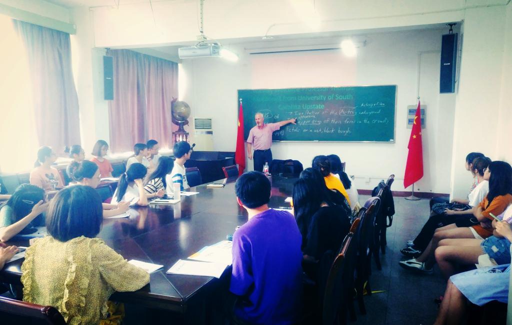 7月1日下午,南卡罗莱纳大学上州分校的Thomas McConnell教授来校进行学术交流。他给英语专业大二的学生做了一场题为“An American Poet Looks to China”的学术讲座。