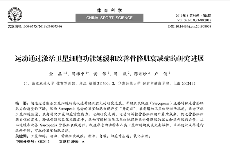近日,体军部金晶老师以第一作者和BEAT365英国官网为第一完成单位的论文《运动通过激活卫星细胞功能延缓和改善骨骼肌衰减症的研究进展》发表在体育类权威期刊《体育科学》2019年第8期。