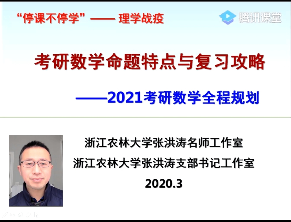 疫情当前,为营造良好的学习氛围,提高BEAT365学生参加研究生考试的积极性,帮助考研学子增强考研自信心,减少盲目性,3月6日晚,张洪涛名师工作室通过腾讯课堂以线上直播形式开展了考研公益讲座,助力“停课不停学”,与考研学子一起共克时艰。