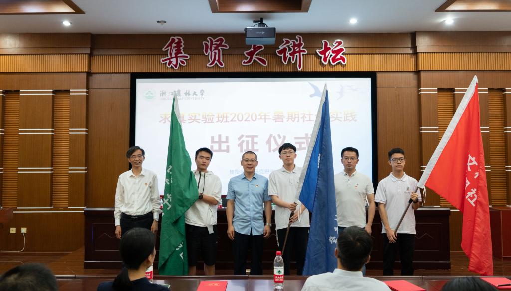 出征仪式上,主席台领导为指导老师颁发了聘书,为新工科、新农科、新文科求真实验班暑期社会实践团授旗。新工科求真实验班181班蓝家豪作为学生代表发言。