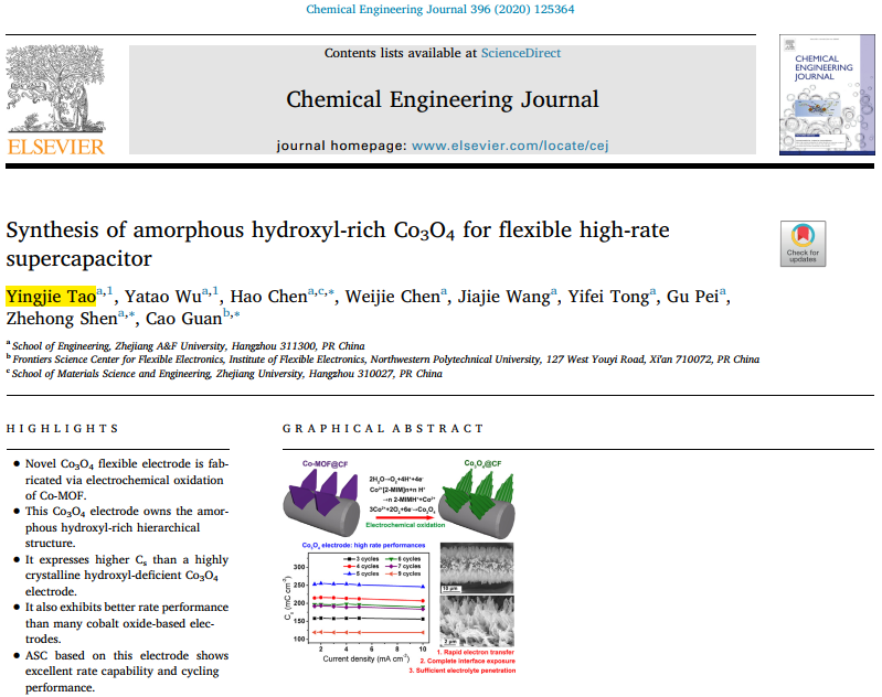 近日,工程学院高分子材料与工程专业2016级本科生陶颖杰以第一作者身份,在工程领域国际权威期刊《Chemical Engineering Journal》(IF=10.652),发表了名为《用于高性能柔性超级电容器的非晶态富羟基Co3O4的合成》(《Synthesis of Amorphous Hydroxyl-rich Co3O4 for Flexible High-Rate Supercapacitor》)的学术论文。